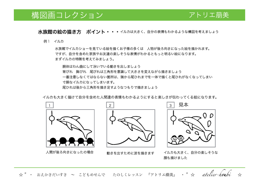→3ページ目に「水族館の絵」の描き方のポイントとイルカの特徴の捉え方の説明が書いてあります。